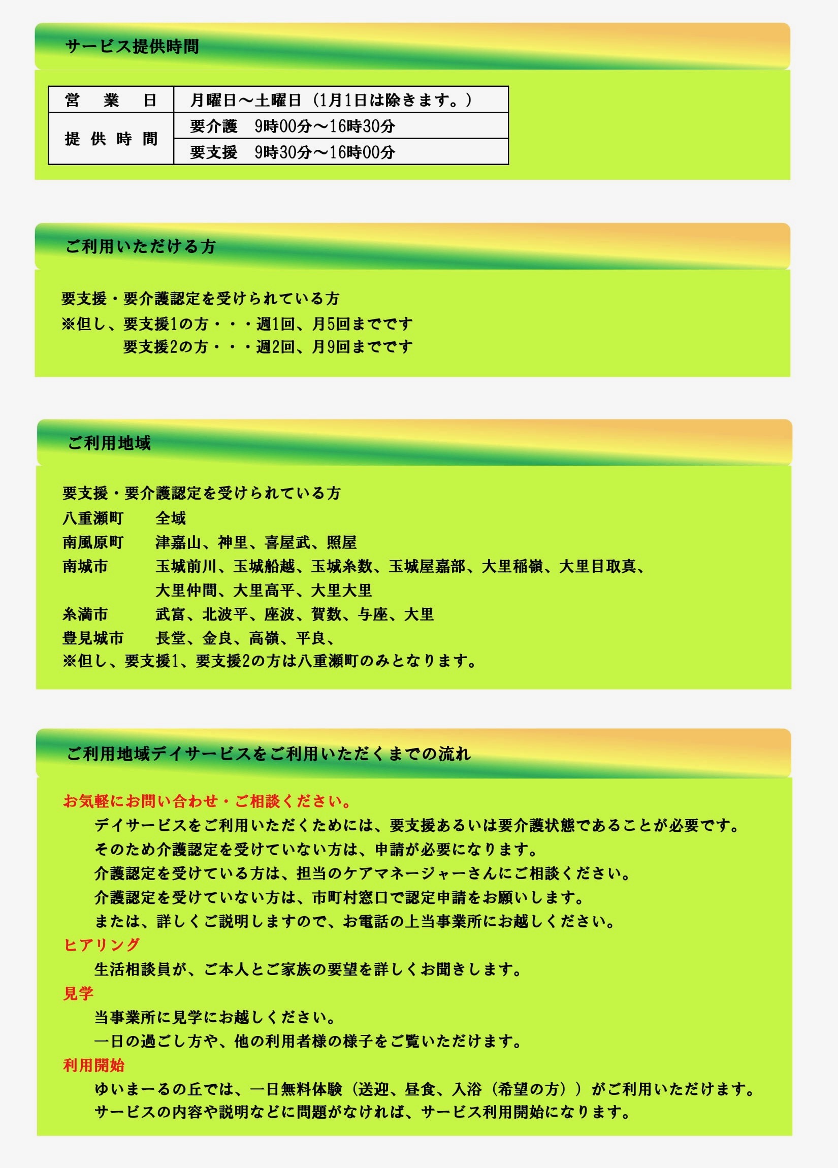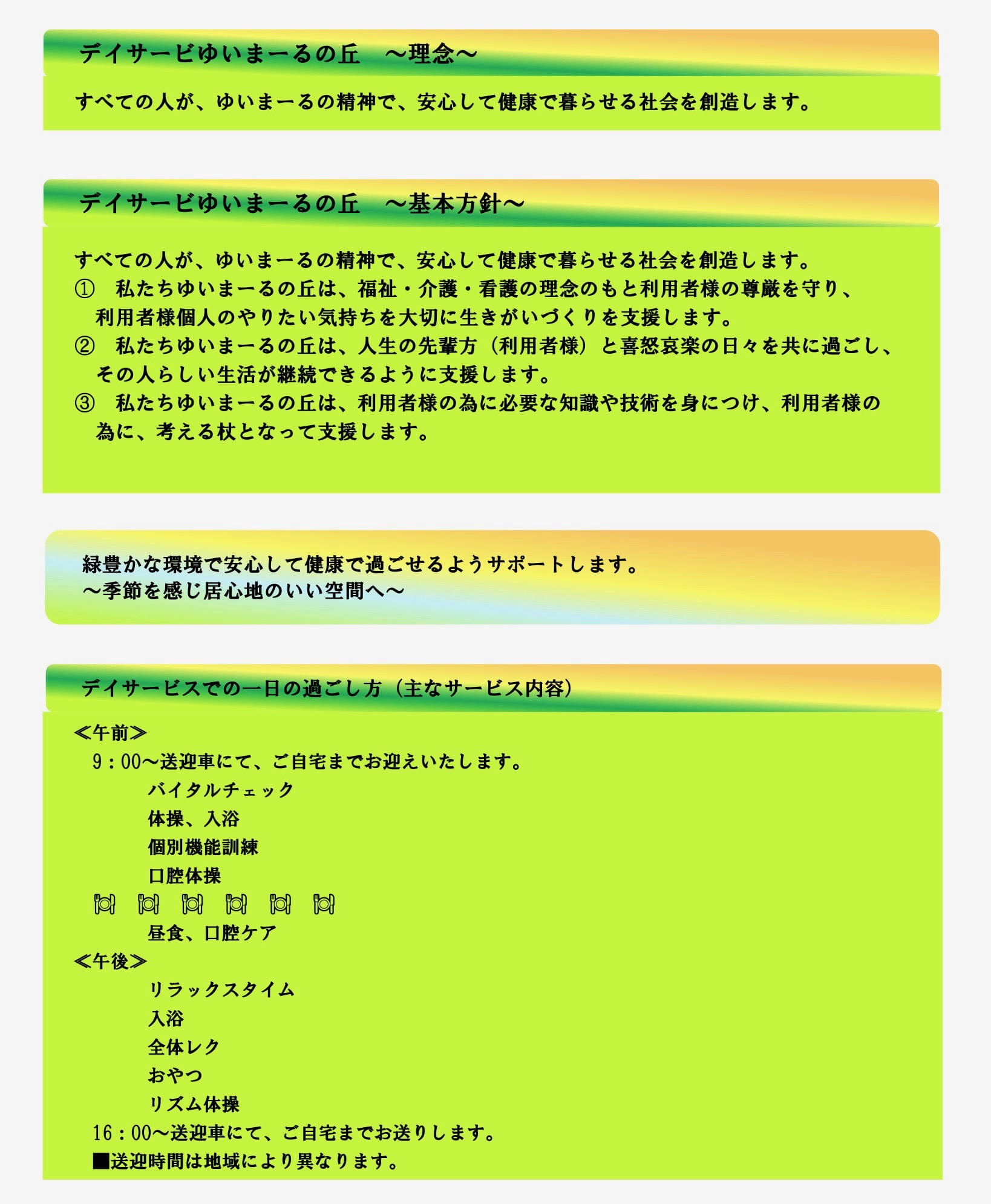 私を育んでくれたこの地、田園風景のなか、緑に囲まれ、鴬(うぐいす)などの野鳥の鳴き声も響く自然環境に恵まれた八重瀬町に「サービス付き高齢者向け住宅及びデイサービスセンターゆいまーるの丘」を 開設することができました。
